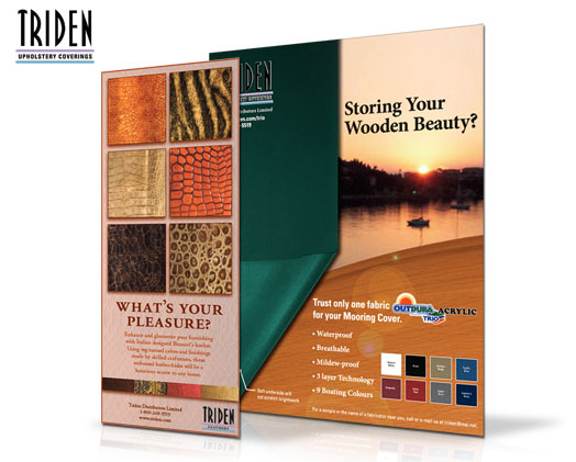 Triden is a Canadian upholstery and fabric distributor who advertises in interior design & trade magazines. The goal of these design ads that are visually interesting while displaying a variety of swatches to show diversity & versatility of the advertised material.